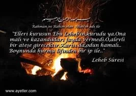 Kâfirler, tüm yardımcılarıyla birlikte ilahi azaba duçar olacaklardır. Bunlar, en yakın eşleri bile olsa. Herkes yaptıklarının karşılığını alacak, kimseye haksızlık yapılmayacaktır. Dünyada müslümanlara yaşam hakkı tanımayanlar, bu yolda kullandıkları tüm yol ve metotlarla kendi azablarına katkı sağlayacaklardır. Kendi ateşinin yakıtını kendiler oluşturacaktır. Ebu Leheb’in karısı aynen eşinin yaptığı gibi İslamın önünde en büyük engel olmaya çalışmıştır. Tam bir aile dayanışması içinde kocasından geri kalmamıştır.